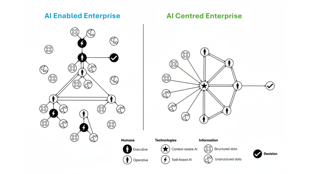 The AI-Centered Enterprise (Bala, Balasubramanian & Joshi, 2025) offers one of the clearest playbooks yet for this new organisational architecture. The authors begin by defining the limitations of today’s AI adoption — fragmented pilots, structured-data basis, and an overreliance on human intermediaries to bridge data, systems, and decisions.
